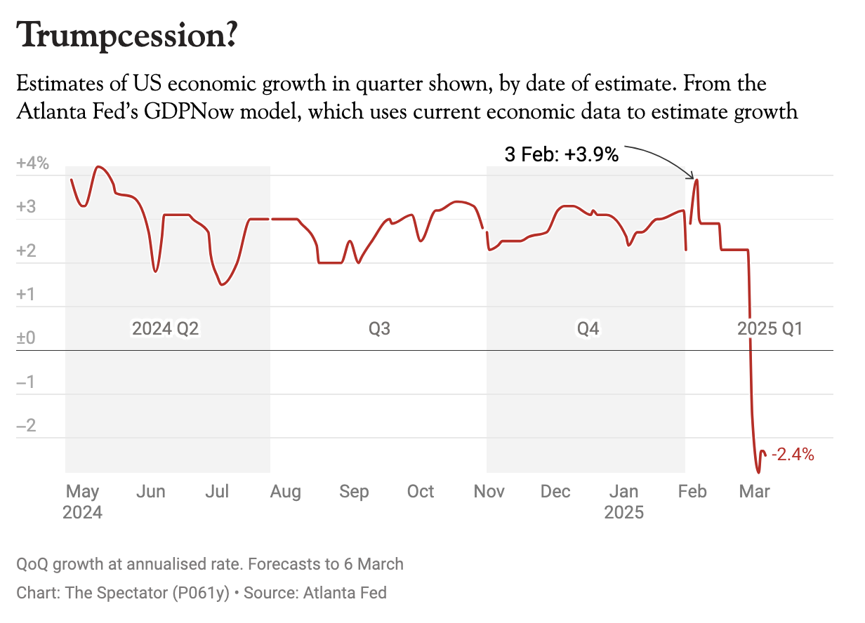 On Thursday last week the Atlanta Fed’s GDP ‘nowcast’ model was forecasting that America’s economy would shrink by 2.4 per cent in the first quarter of this year – a slight improvement on the 2.8 per cent contraction it had predicted three days earlier. If this reading for the first three months of 2025 proves to be true, and things don’t pick up shortly, could the USA be heading for recession?