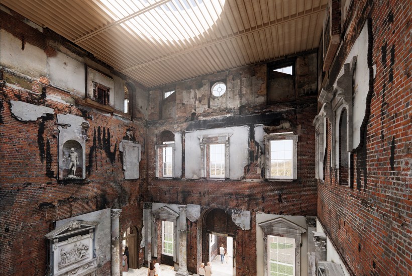 In April 2015, a fire raged through Clandon Park, destroying much of the 18th-century Palladian mansion’s prized interiors. Contrary to all expectations, the National Trust, its custodian, announced plans to keep the Grade I-listed building ‘as a ruin’. Architects Allies and Morrison would ‘creatively curate’ the celebrated property as ‘a country house laid bare’, adding a modern roof and walkways, but otherwise leaving the interior in its half-charred form. Last month, Guildford Council waved through the plans unanimously.