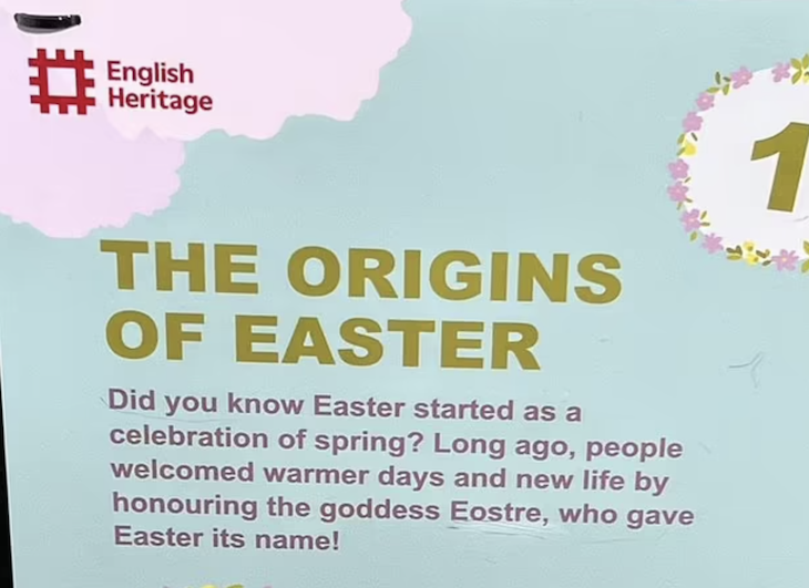 ‘Did you know Easter started as a celebration of spring?,’ children who take part in the trail are told. Any mention of Christ or Christianity is omitted from that sign, which has been planted at English Heritage sites across the country. However, one god does get a look in. This first panel, decorated with children collecting flowers, painted eggs and a cheery Easter bunny, gave the following account of the origin of Easter: