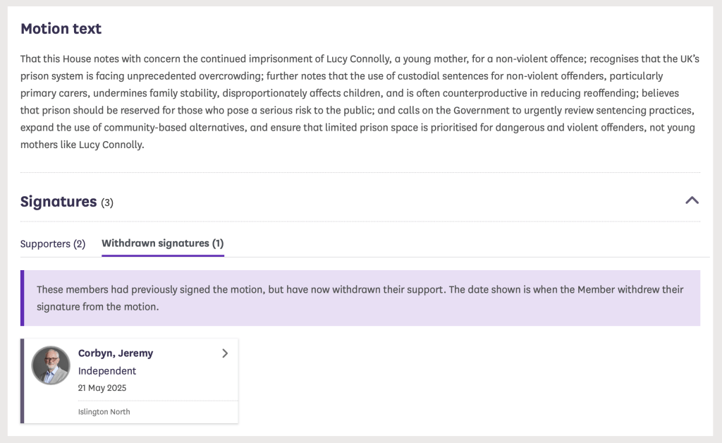 That this House notes with concern the continued imprisonment of Lucy Connolly, a young mother, for a non-violent offence; recognises that the UK’s prison system is facing unprecedented overcrowding; further notes that the use of custodial sentences for non-violent offenders, particularly primary carers, undermines family stability, disproportionately affects children, and is often counterproductive in reducing reoffending; believes that prison should be reserved for those who pose a serious risk to the public; and calls on the Government to urgently review sentencing practices, expand the use of community-based alternatives, and ensure that limited prison space is prioritised for dangerous and violent offenders, not young mothers like Lucy Connolly.