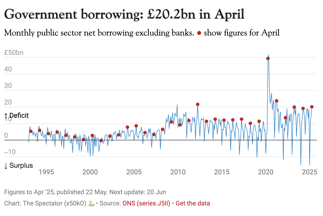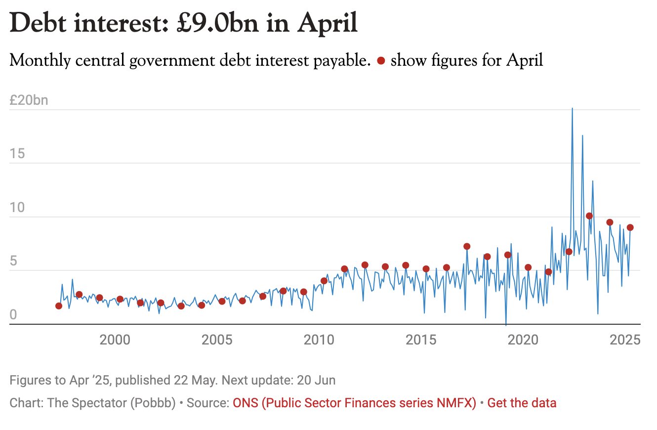 This, too, promises to have second-round effects on the public finances, as it means interest rates will stay higher for longer. One positive piece of news is that the government had to spend £0.5 billion less in April 2025 servicing its debts than it had to spend in April 2024, as interest rates fell. However, the government can no longer hope for two further interest rate cuts this year to help bail it out. At £100 billion a year, servicing debt is becoming a very significant part of the government’s budget – more than it spends on education or health.