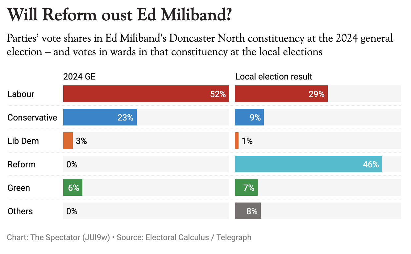 To the green thorn in Sir Keir Starmer’s side: Net Zero Secretary Ed Miliband. The lefty veteran may have spent two decades in Westminster engraving stones and taking aim at airport terminals, but all that could be set to end in 2029 if Reform UK’s local election results are anything to go by. Analysis of the May elections suggest that Nigel Farage’s party could elect 81 MPs across the areas that voted in the recent council polls – ousting Miliband in the process. Dear oh dear…