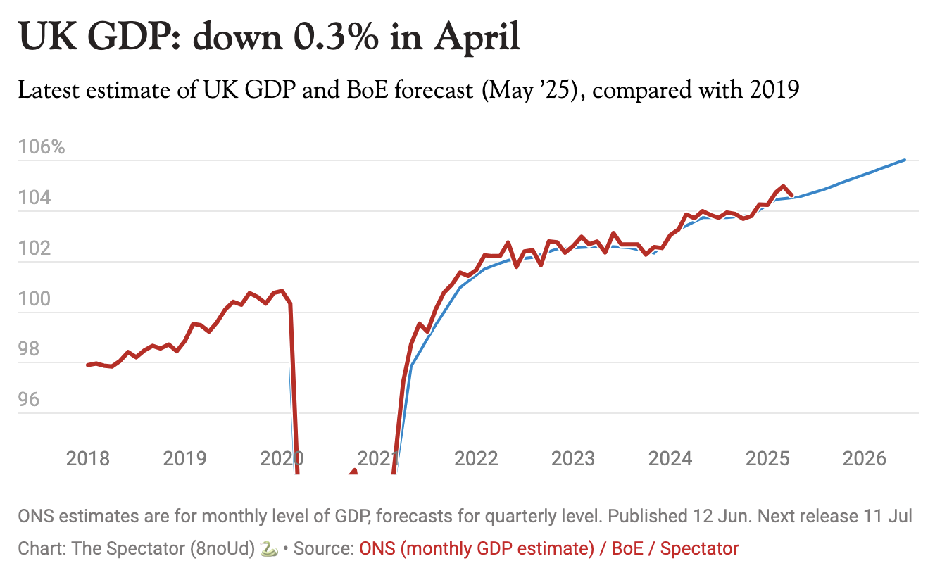 Rachel Reeves delivered her spending plans for the next three years less than 24 hours ago, but already the credibility of the Chancellor’s plans are in doubt. GDP fell by 0.3 per cent in April, according to figures released this morning by the Office for National Statistics (ONS). It spells the end of a run of more positive economic readings that Reeves had hoped would buy her room to manoeuvre in the run up to the Autumn budget – when she will have to explain to the Office for Budget Responsibility, and the nation, how her spending review sums add up.