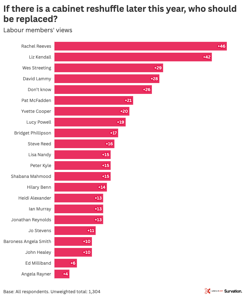 It never rains but it pours. Rachel Reeves really isn’t having a good time at the Treasury. First, there was the £1bn winter fuel U-turn. Then, came the £1.5bn welfare concessions. And now, some new polling has dropped which makes for grim reading for the Chancellor. LabourList has this morning published the latest findings from its most recent poll of Labour members.