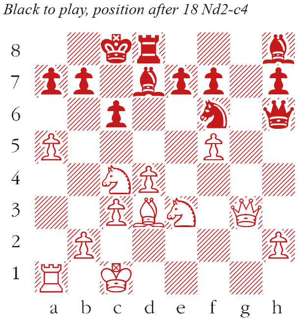 1 a4 d5 2 g4 c6 3 f4 g6 4 e4 dxe4 5 Bxe4 Bd7 6 Ne3 Ne6 7 c3 Na6 8 f5 gxf5 9 gxf5 Rxg1 10 Qxg1 Nec7 11 Bg3 Ne8 12 d4 Nf6 13 Nd2 O-O-O 14 Bd3 Nc7 15 a5 Qh6 16 Bxc7 Kxc7 17 Qg3+ Kc8 18 Ndc4