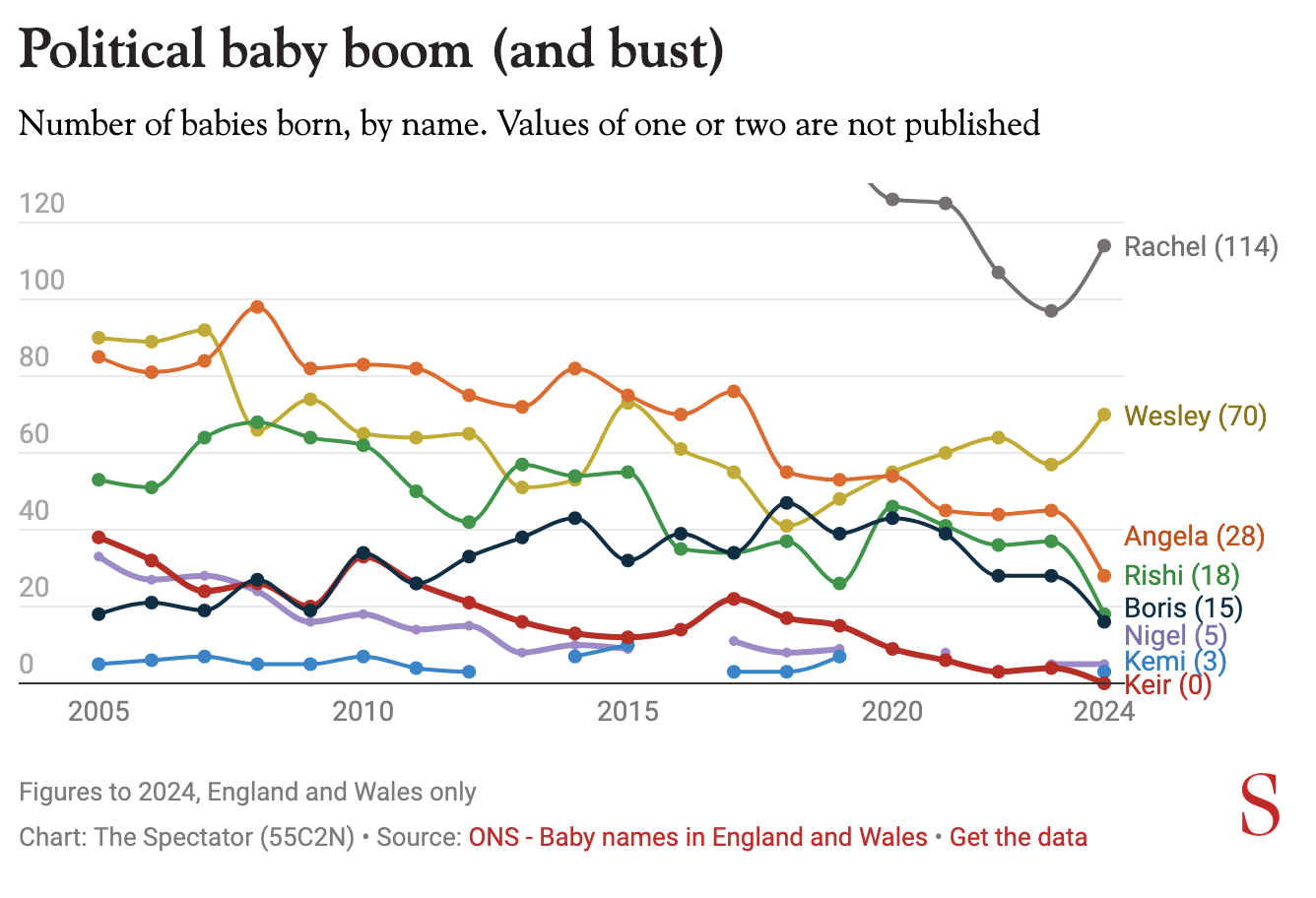It transpires that a grand total of, er, zero children were called ‘Keir’ last year. According to data released today by the Office for National Statistics, the PM’s first name was nowhere to be found on the list of most popular names for boys and girls in England and Wales. While the name had fast been losing favour for a while – only four baby Keirs were born in 2023 – this is the first time on record that no one opted to give their newborn the same name as Starmer. Oh dear…