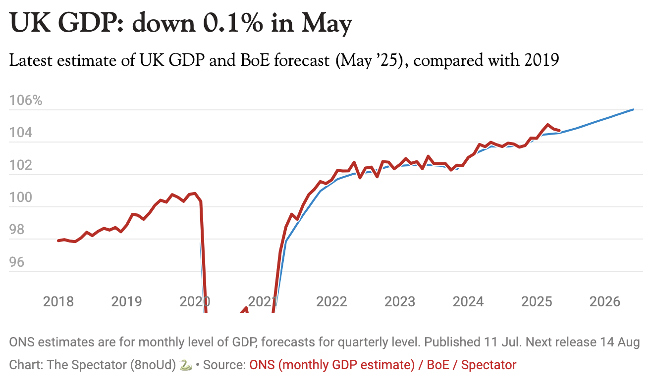 If Rachel Reeves is looking for any good news (and she will be), she can point to the three-month figures, which show growth of 0.3 per cent in the three months to May. However, the ONS made clear this was because of tariff front-loading as businesses brought forward activity from the second half of the year to beat the effects of Donald Trump’s import taxes. The result will almost certainly mean weaker growth in the months to come.