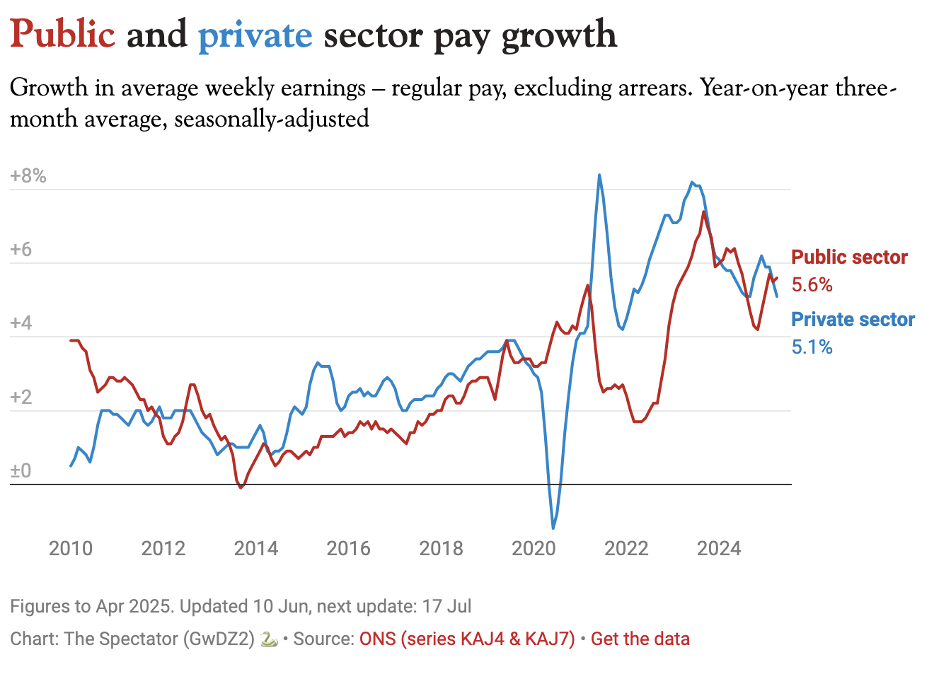 More generally, those in the public sector are out performing their private sector counterparts, with public sector pay rising 5.6 per cent in the public sector vs 5.1 per cent at the last reading. Though it is fair to note this has come after a period of private sector wage packets growing far faster than public sector.