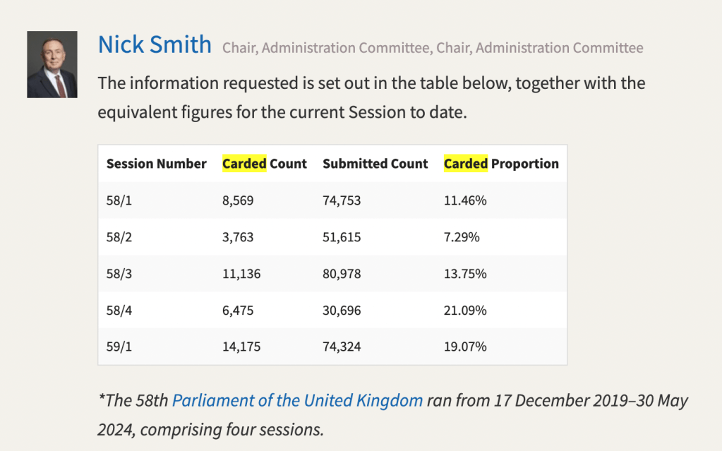 Helpfully, an answer to a parliamentary question by Kevin Hollinrake last month sheds some light on the data. One in five questions submitted thus far in this current parliament have been ‘carded’ – compared to just over in ten at the beginning of the last parliament. Perhaps poor parliamentary etiquette is to be expected when over 50 per cent of the MPs are new to the House. Hopefully, the freshers find their feet soon and the number starts to fall….