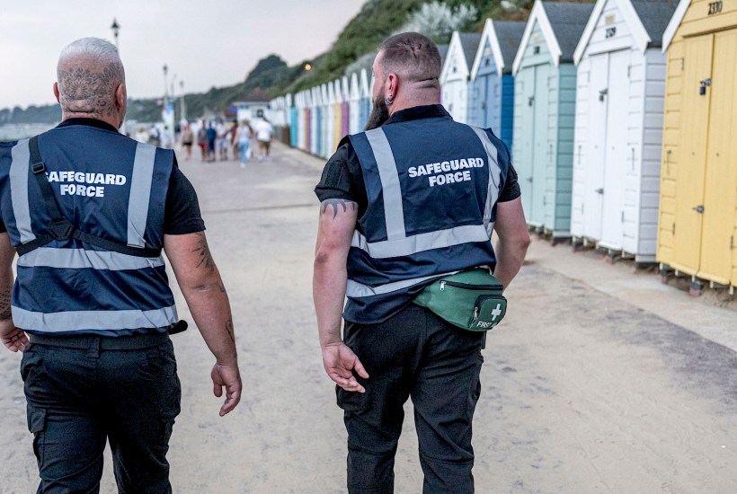 As the sun sets on Alum Chine, a man on a run yells ‘cunts’ at our patrol on the promenade. He jogs off, returns, and throws up his middle fingers. He scuttles away again. All the officers are wearing high vis jackets with ‘Safeguard Force’ printed on the back, and many people will have read bad things about the group online. I guess this runner is one of them. A few days ago, there was a protest in Bournemouth against the use of hotels to house asylum seekers, and a number of people have assumed that Safeguard Force, coming at a similar time, is the design of a radical segment of the demonstrators.