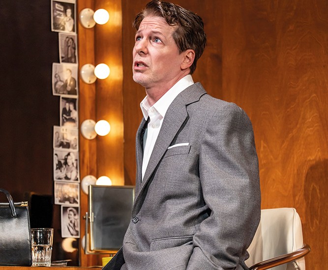 The backstory is complicated. Oscar has been secretly committed to a mental asylum and his wife gets him released for a few hours so he can do an interview on Jack Paar’s TV show. It takes two long scenes to explain this improbable set-up but it’s worth it because Oscar (Sean Hayes) is such a lovable character. He’s a total wreck, addicted to drugs, suffering from OCD, and afflicted by aural and visual hallucinations that leave him curled up on the floor like a baby. He can’t drink a cup of coffee without stirring it clockwise and anti-clockwise eight times.