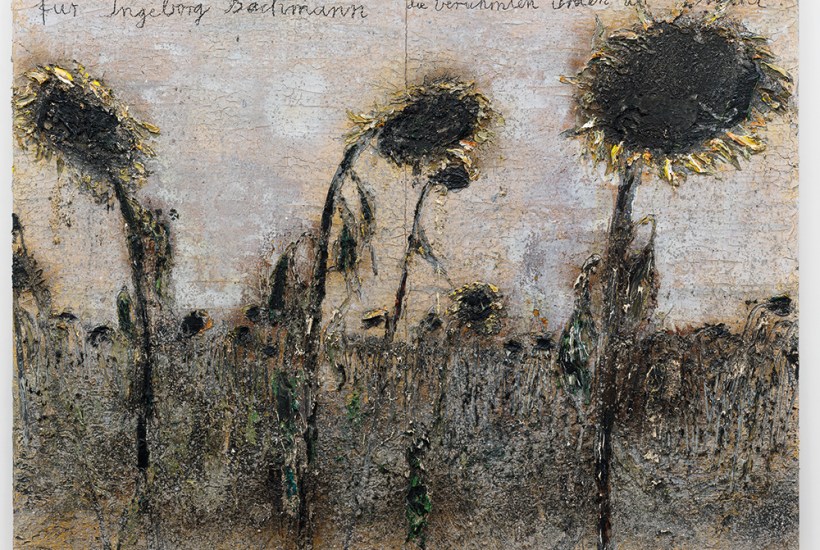 Over the road at White Cube, however…yikes. Produced on a gargantuan scale, his new paintings retread the old line about the weight of history (lead!) and are packed with withered pastoral imagery and performative Teutonic guilt. Besides this, there are plenty of foreboding inscriptions – some in German, some, alarmingly, in pseudo-Homeric Greek script. The Kiefer of 2025 has a very heavy-metal vibe to him: the doom-auguring sunflower paintings here would look great on the cover of a Metallica record.