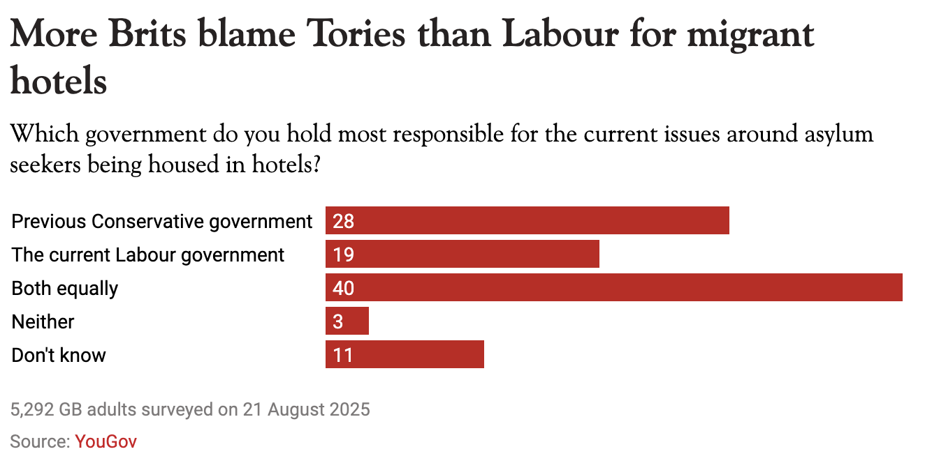 But who does the public believe is to blame? Well, polling giant YouGov consulted 5,292 British adults today to find out. The results are rather interesting: more Brits blame the previous Conservative government than Sir Keir Starmer’s army for the migrant hotel problem. A third of British adults believe the last Tory administration is to blame, with less than a fifth pointing the finger at Labour. However four in ten adults say the responsibility rests with ‘both equally’, while one in ten adults don’t know. It’s slightly more positive news for Labour, but Home Secretary Yvette Cooper still has her work cut out…
