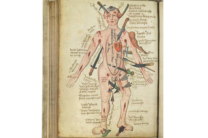 The image of the ‘Wound Man’ (or rather, images with variations) first emerges at the end of the 15th century in a group of Bavarian medical manuscripts, and has since been reproduced and reinterpreted multiple times throughout Europe in surgical treatises. To us today, these tables offer a striking combination of vividness, human suffering, love of detail, medical knowledge and practicality.