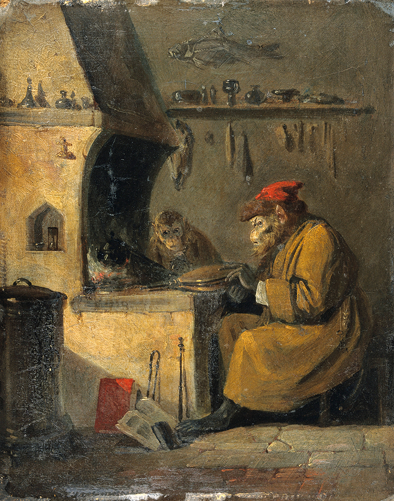 A satirical 19th-century painting by Edmund Bristow portrays the monkey alchemist attending to his furnace, one foot propping open his workbook, his experiment closely watched by his assistant [Wellcome Collection, London]