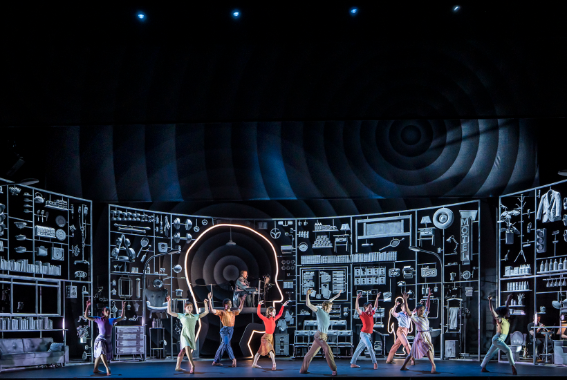 To fill this scenario out, Watkins introduces the ghost of Jim and a spectral corps de ballet, who haunt and mirror George’s grief and anxieties. Inside a neon-lit head above the stage, sits the celebrated American crooner John Grant, who at intervals contributes lugubriously introspective songs blessed with vapid lyrics such as ‘Am I now I am now’. The choreography is earth-bound, full of torsion and overtly sexual imagery. Some of it is inventive and effective – I liked its representation of a tennis match and a midnight swim – but much of it simply drifts.