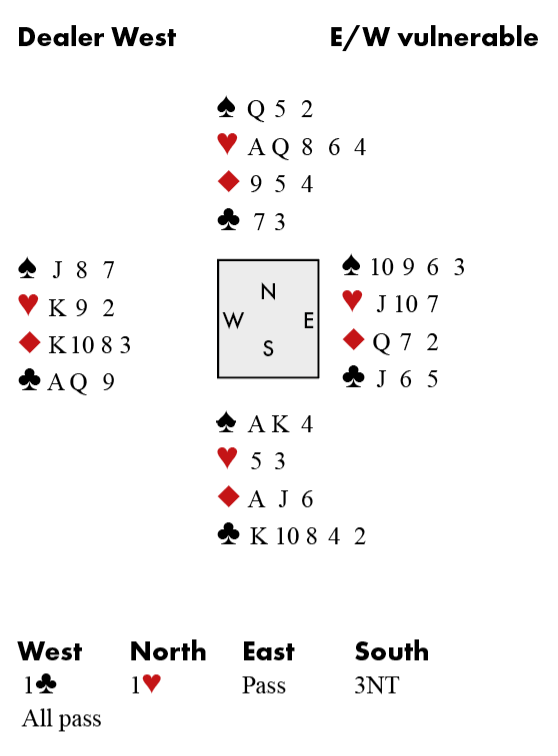 South was a bit squeezed for bids at his turn; both 2♣ and 2NT would have shown support for Hearts, so 3NT it was, and West annoyingly found the best lead of the ♦3 to East’s Queen.