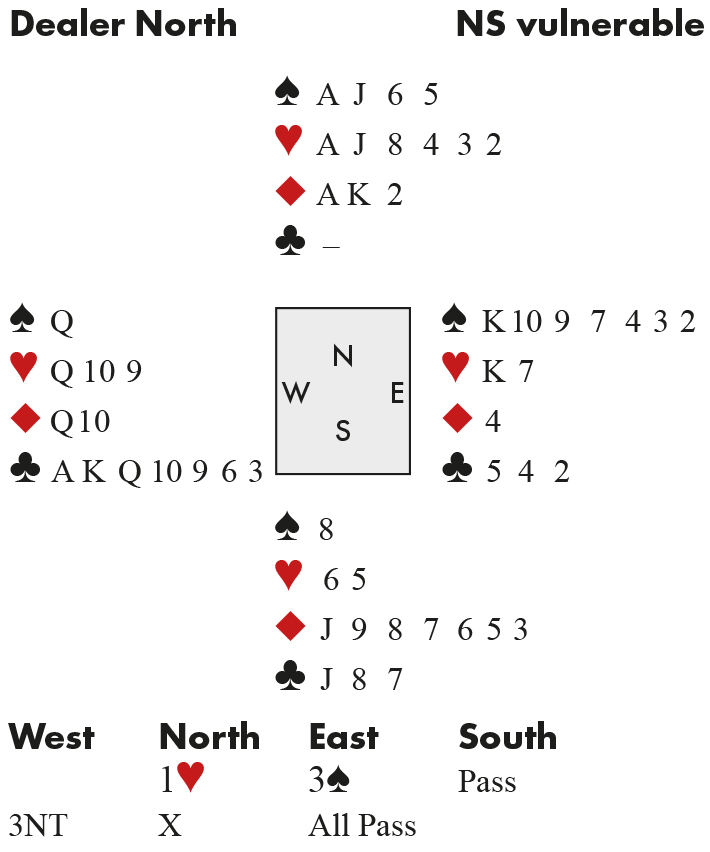 In the other room, West passed 3♠ and North bid 4♥, which made with an overtrick. Christian chose to bid 3NT, and when Finn (North) doubled, he didn’t run. Finn led the ♥4 to Christian’s ♥10. This had to be good: the opps could make a vulnerable game or could have taken him five down. One down was a great result. But no, Christian had higher aims. Cool as anything, he played the ♠Q! Finn won and – quite reasonably – continued with ♥A and another heart. Christian won with the ♥Q and claimed the rest of the tricks.
