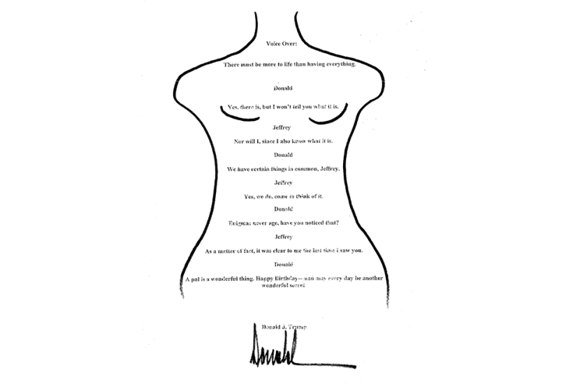 The “bawdy” birthday letter from Donald Trump to Jeffrey Epstein, which the Wall Street Journal reported the existence of in July, has been released for all to see. The bawdiness is somewhat wanting – the “small arcs” of the naked woman’s breasts which the Journal described are indeed very small. There’s nothing explicit in its imaginary dialogue between the two men, which begins with a pensive “voice over” saying “There must be more to life than having everything.” It’s creepily cryptic, at worst.