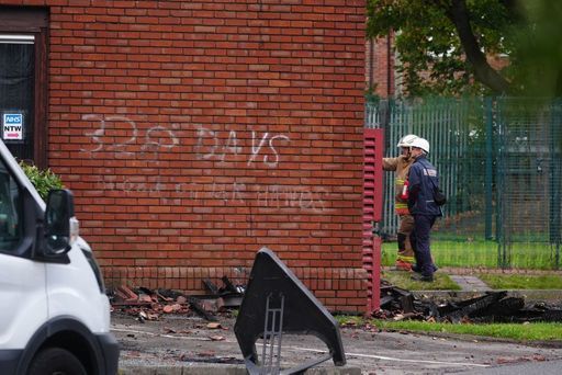 Graffiti on a wall as Emergency services look the scene at the MP for Washington and Gateshead South Sharon Hodgson’s office in Washington, Sunderland which has been damaged by a blaze. Picture date: Thursday September 11, 2025. Credit: Owen Humphreys/PA Wire/PA Images