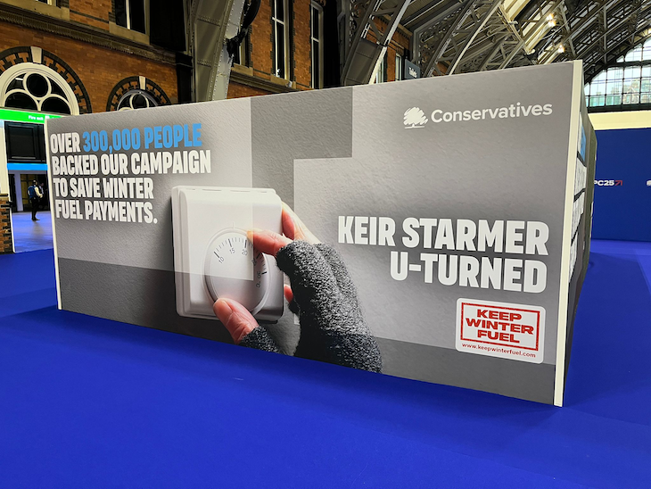 In the exhibition hall of the Conservative conference in Manchester there’s a wall-sized sign celebrating the fact the Tories’ campaign against the winter fuel allowance cuts contributed to Keir Starmer’s u-turn. Defending a cash bung to the elderly – that many of whom do not spend on heating – doesn’t seem something the party of ‘fiscal prudence’ should be particularly proud of.