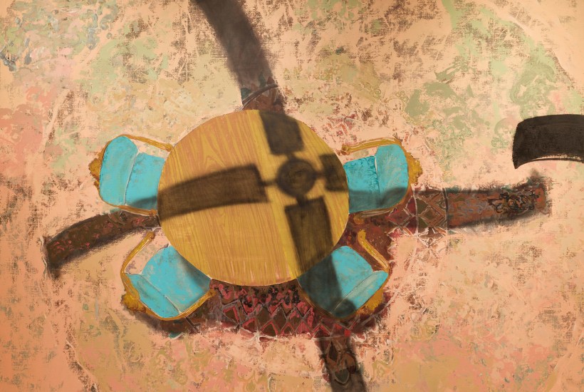 Moving on from displays that look like good art to one that actually contains it, we come to the painter Mohammed Sami (b.1984). Originally from Baghdad, Sami endured a miserable stint as one of Saddam Hussein’s pet portrait painters in his youth, and the horror of that time still clearly haunts him. His 2023 exhibition at Camden Art Centre was one of the most exciting contemporary painting shows I’ve seen, announcing the arrival of a supreme talent with the capacity to reinvent his form. Menace is ever present in these works, whether embodied by a lightbulb throbbing red as a metonym for dictatorship’s total control of message, or via the sinister green lasers quadrisecting a huge, ominously lit woodland scene in a huge landscape called ‘The Hunter’s Return’. He even includes a likeness – of sorts – of his late client Saddam, obscuring everything but the dictator’s chin, moustache and medal-bedecked chest with what looks like cheap domestic paint. If he doesn’t win, something has gone very wrong here.