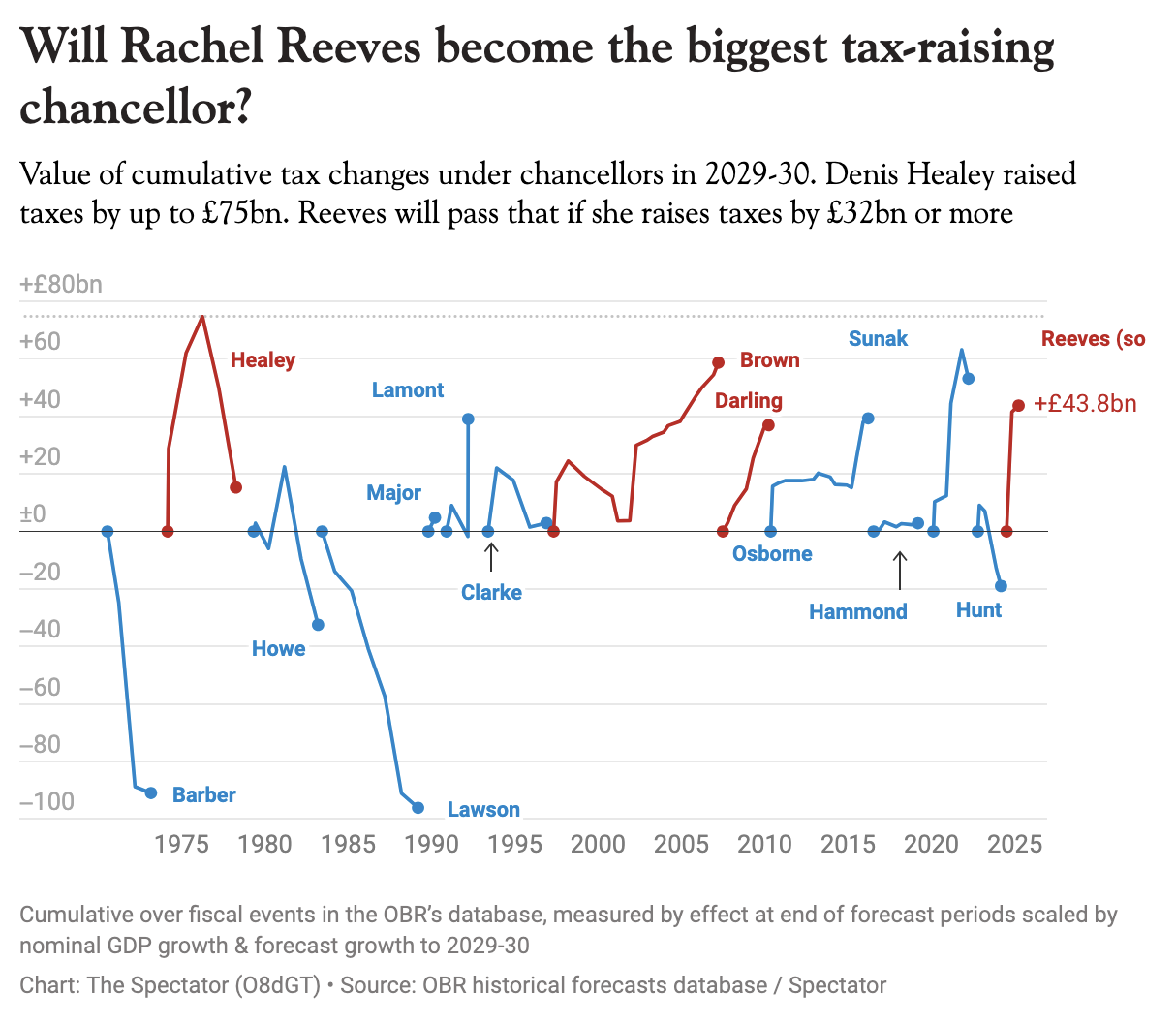 The big question, though, is how far she goes on tax – and how voters react. Whatever she says, taxes on workers are going up, and the spirit of Labour’s manifesto pledge will be broken. The cynical calculation in avoiding an explicit rise in the basic rate is that threshold freezes are less visible to voters; the Treasury has seen polling which suggests this works. But a tax rise is a tax rise, however it’s packaged up. And if Reeves increases the burden by over £32 billion (in 2029–30 terms), she will become the biggest tax-raising chancellor in history.