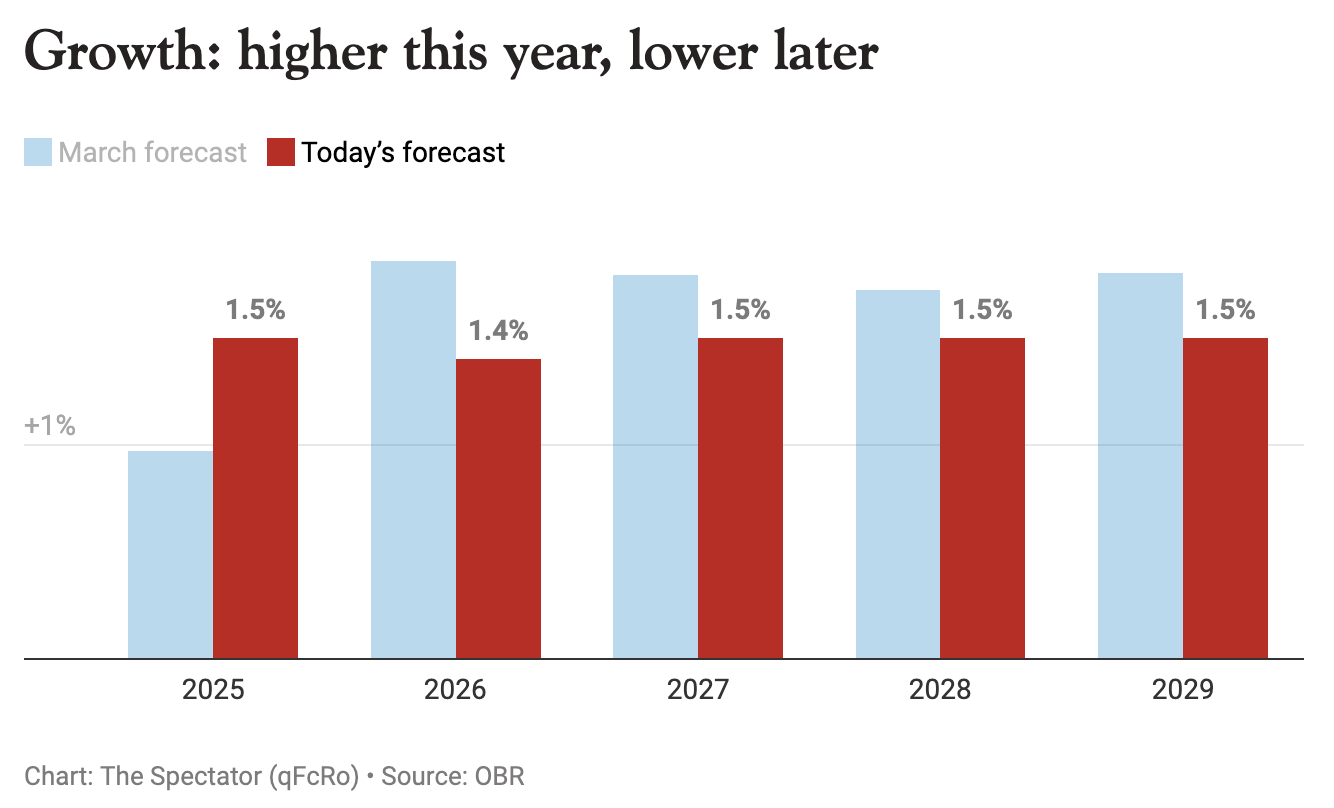 In more bad news, inflation was revised up. The OBR found: ‘Greater domestically generated inflation, alongside higher food prices, mean we also expect inflation to stay higher for longer than in March.’ Inflation this year, the OBR says, will be 3.5 per cent and then 2.5 per cent next year – some 0.2 and 0.4 percentage points higher than expected at the Spring Statement. The OBR’s verdict is clear: Reeves has made the cost of living worse. Price rises will not return to the Bank of England’s 2 per cent target until 2027 – a whole year later than had been forecast in March.