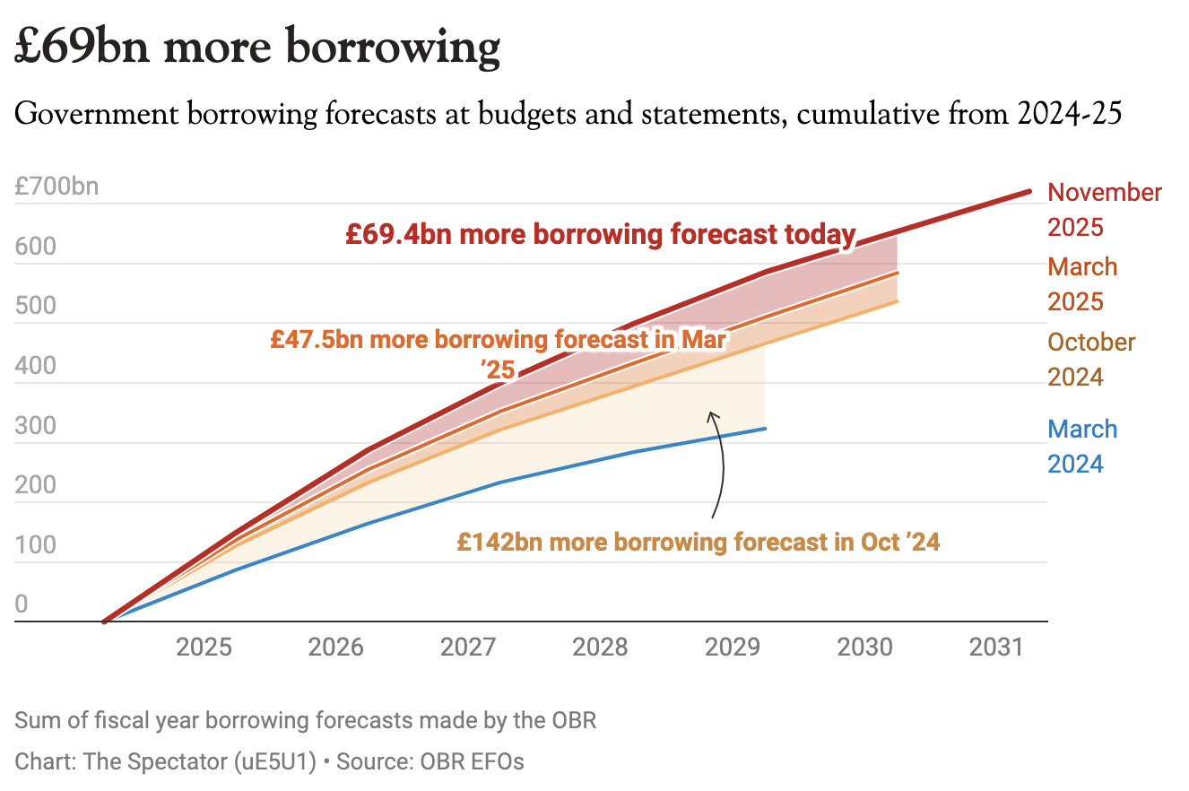 The surprise in the Budget was that the black hole, of which so much had been briefed, was far smaller than expected. Increased tax revenues and upgrades to wage growth offset what was still a large downgrade to productivity growth. The result: the knock to Reeves’s headroom was only £6 billion and her tax measures mean she has left herself with a much larger margin for error of £22 billion. Her hope will be that this number alone will reassure investors, shrink gilt yields, reducing the cost of borrowing and giving her even more headroom next time. However, the OBR still thinks this headroom is pretty small. They put her chance of meeting the rules at just 59 per cent.