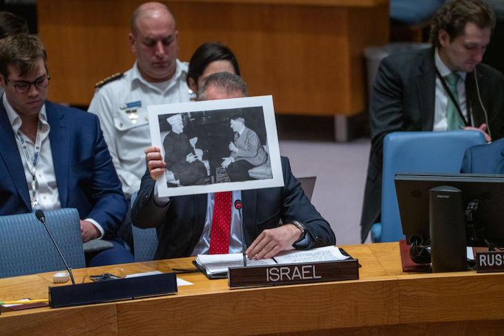 An Israeli delegate at the UN holds a picture of Haj Amin al-Husseini meeting Adolf Hitler (Getty Images)
