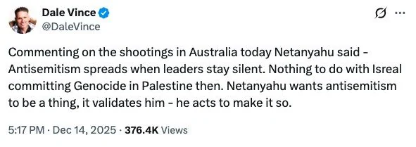 My words on this subject were not intended to excuse or legitimise terrorism, or any form of racism – what happened at Bondi beach is an atrocity. My words are aimed at the intervention of Netanyahu who in my opinion overlooks the impacts of his own terrorism. If anti semitism is rising in the world today then surely on any rational analysis, the biggest single cause of that will be the genocide in Palestine. I condemn all acts of violence and all forms of racism.