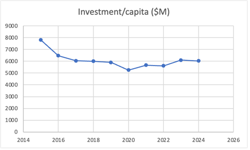 Australian income growth has been especially fostered by mining booms during the late 1960s, early 1970s, and during the 30-year period from the mid 1980s. Since then, investment has flagged. In per capita terms – and excluding the renewable investment that is dependent on subsidies (and actually destroys productive investment), real annual per capita investment fell from around $8,000 to $6,000.