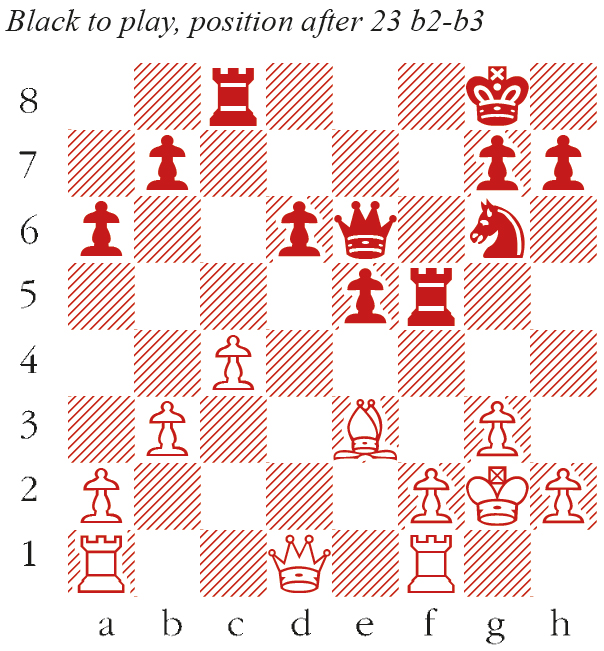 1 c4 Nf6 2 Nc3 e5 3 e3 Nc6 4 Nge2 Be7 5 a3 d5 6 cxd5 Nxd5 7 Nxd5 Qxd5 8 Nc3 Qd6 9 Bc4 O-O 10 b4 Be6 11 Nb5 Qd7 12 Bxe6 fxe6 13 Nc3 Qd3 14 Bb2? Already the decisive mistake (see diagram 1) Nd4!! A masterstroke, with the ingenious point that 15 exd4 is met by 15…Rxf2!! 16 Kxf2 Rf8+ and now 17 Kg1? Qxd4 is mate (revealing the point of the knight sacrifice). Alternatively, 17 Ke1 Bh4+ 18 g3 Bxg3+ leads to mate. 15 Rc1 There is no other way to meet the threat of Nd4-c2+ Bh4 16 Rf1 Qf5! Inducing the decisive weakness 17 g3 Nf3+ 18 Ke2 Rad8 19 d3 Ng1+! White resigns before a blow lands on d3 or f2.