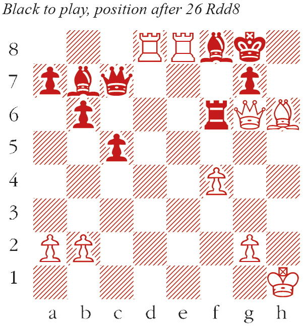 1 d4 d5 2 c4 e6 3 Nf3 Nf6 4 Nc3 c6 5 e3 Nbd7 6 Qc2 b6 7 cxd5 exd5 8 Bd3 Be7 9 O-O Bb7 10 e4 dxe4 11 Nxe4 O-O 12 Ne5 Nxe5 13 dxe5 Nxe4 14 Bxe4 h6 15 e6 Qc7 Walking into a trap. Instead, 15…fxe6 16 Bxh6 gxh6 17 Bxc6 Bxc6 18 Qg6+ leads to a draw. 16 exf7+ Rxf7 17 Bd5! Winning rook for bishop, though the game isn’t over. Rf8 18 Bxh6! Bd6 19 Bxf7+ Rxf7 20 Qg6 Bxh2+ 21 Kh1 Be5 22 Rae1 c5 23 f4 Bd6 24 Re8+ Bf8 25 Rd1  This works out well, but 25 Bg5! was stronger. Rf6 26 Rdd8 (see diagram) Clever, since 26…Rxg6 27 Rxf8+ Kh7 28 Rh8 is mate! But after the cool 26…Bc6! there is nothing better than 27 Rxf8+ Rxf8 28 Qe6+ Qf7 29 Rxf8+ Kxf8 30 Qxc6 gxh6 31 Qxh6+ with a long struggle ahead. Instead: Bxg2+? and the game is over. 27 Qxg2 Rxh6+ 28 Kg1 Rf6 29 Qd5+ Kh7 Black resigns before 30 Rxf8.