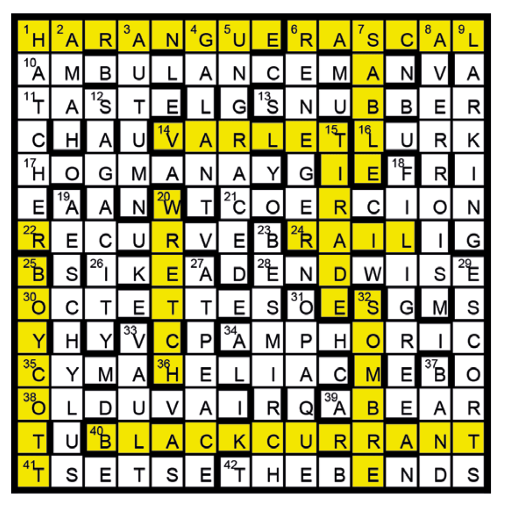 Associations with BLACK were 7 SABLE, 25 BOYCOTT and 32 SOMBRE; with CUR 6A RASCAL, 14 VARLET and 20 WRETCH; and with RANT 1A HARANGUE, 15 TIRADE and 24 RAIL.