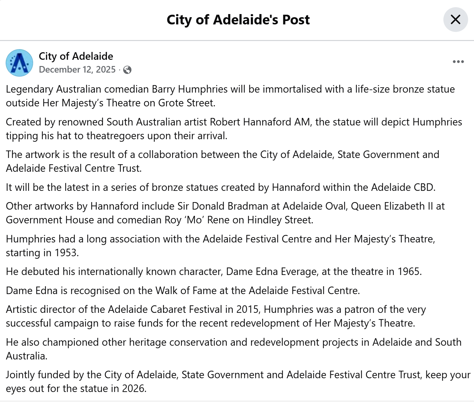 Soon, theatre-goers strolling past Her Majesty’s Theatre in Adelaide – the very stage where Barry Humphries made his theatrical debut as a 19-year-old in 1953, and later called his favourite theatre in the world – will encounter a new bronze statue in his honour.