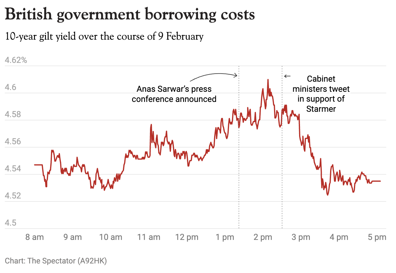 Over in my own economics beat though, the question all my contacts are pondering is, obviously, what whoever comes next means for them and by extension: all of us. As Anas Sarwar spoke, the 10-year gilt yield – the ones crucially used in Office for Budget Responsibility forecasts – shot up to a four-month high and the pound slumped as markets worried about an economic lurch to the left. But once the cabinet’s tweets were all counted present and correct, the sell-off eased and yields returned to normal. In the end there has been barely any move in the market when you compare open to close.