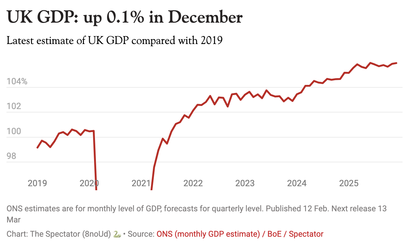 Today’s numbers mean we also have growth figure for the whole of 2025 which adds up to 1.3 per cent or just 1 per cent on a per head basis. These numbers – which are reflective of a year of uncertainty caused by both Donald Trump’s tariffs and, more importantly, Rachel Reeves’s budgetary flip flopping – are nothing to celebrate.