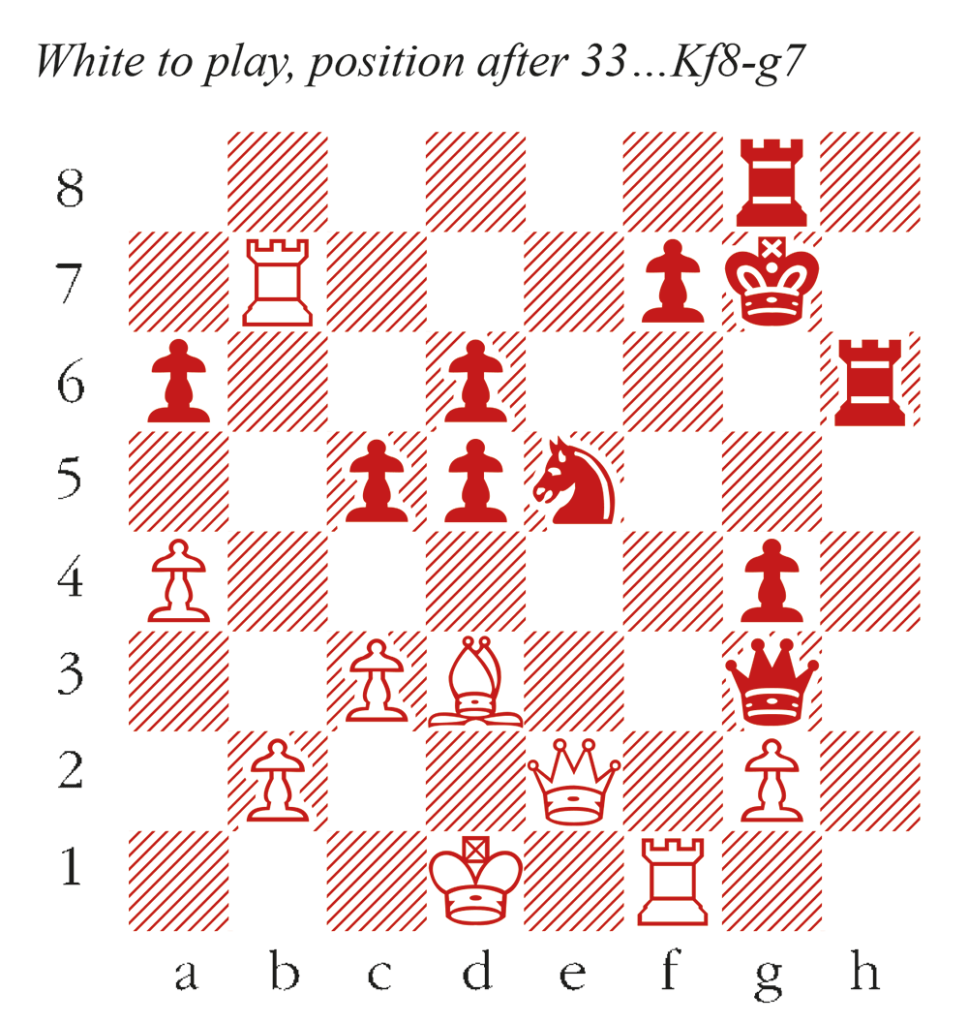 His opponent, David Anton Guijarro is Spain’s strongest grandmaster, and if the position were presented to him as a puzzle, he would certainly spot the strongest move in a couple of seconds. White can win with 34 Qxe5+!! with a beautiful finish after 34…dxe5 35 R1xf7+ Kh8 36 Rh7+ Rxh7 37 Rxh7 mate.