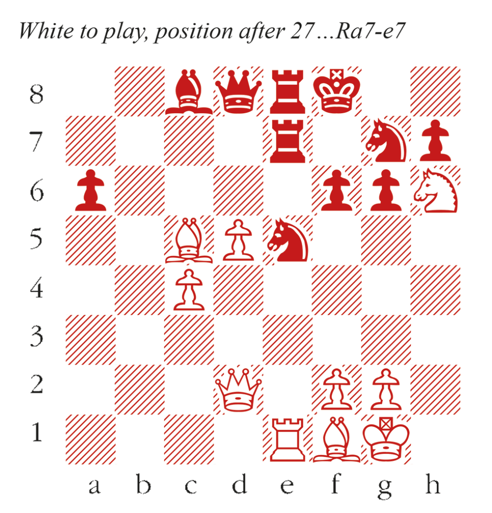 Capturing the rook on e7 leaves White a piece down, but there is something far stronger: 28 Rxe5!! fxe5 29 Qg5 A quiet follow-up, threatening Qg5-f6 mate. Carlsen has but one defence: Nh5 30 Qxe5! One more move, threatening Qe5-h8 mate. Carlsen resigned with a smile, obviously impressed by the finish. Nevertheless, he won this semi-final match against Lazavik, before defeating Alireza Firouzja in the final.