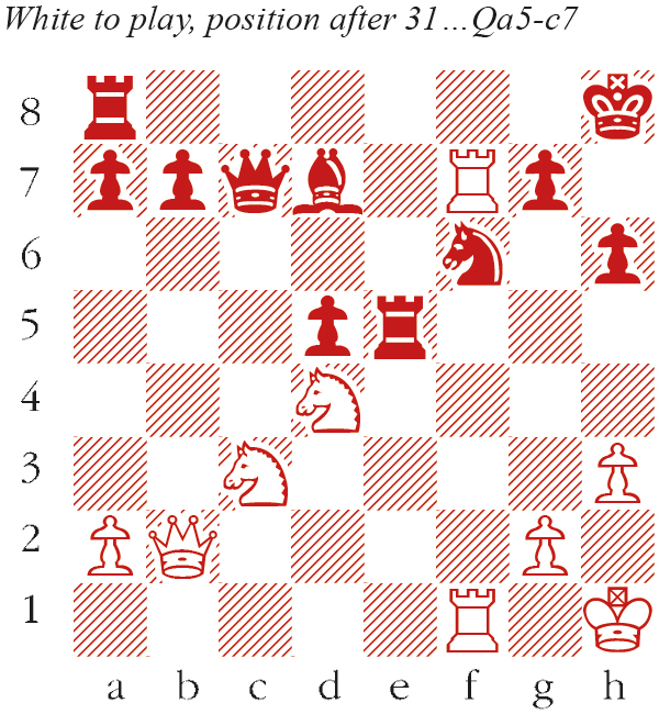 Instead: 32 Ncb5! Qc4 Or 32…Qd8 33 Nc6 Bxc6 34 Qxe5 Bxb5 35 R1xf6 gxf6 36 Rxf6 is crushing. 33 R1xf6 gxf6 34 Qf2! Much stronger than 34 Rxd7 Qf1+ 35 Kh2 Rg8 when Black is the one making threats to the king. Qc1+ 35 Kh2 Qg5 36 Rxd7 Black’s kingside is shattered, so the threats stemming from Nb5-d6 are too strong. Re4 37 Nd6 Qe5+ 38 g3 Qxd4 39 Nxe4 Qxf2+ 40 Nxf2 Rc8 41 Rxb7 Rc2 42 Kg1 Rxa2 43 Ng4 Black resigns as his loose pawns will drop off soon.