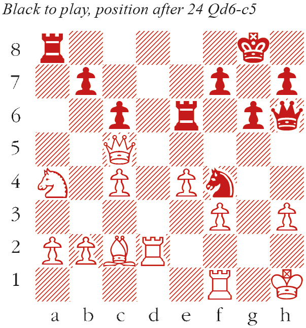 In the diagram below, the tempting 24…Qxh3+ 24 Kg1 Qg3+ 25 Kh1 is only a draw, since 25…g5 26 Rh2 covers the threats.