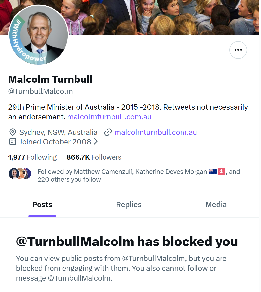 As I casually went to check on Turnbull’s X account, I discovered that I was blocked. Not my personal account … The Spectator Australia had been blocked.