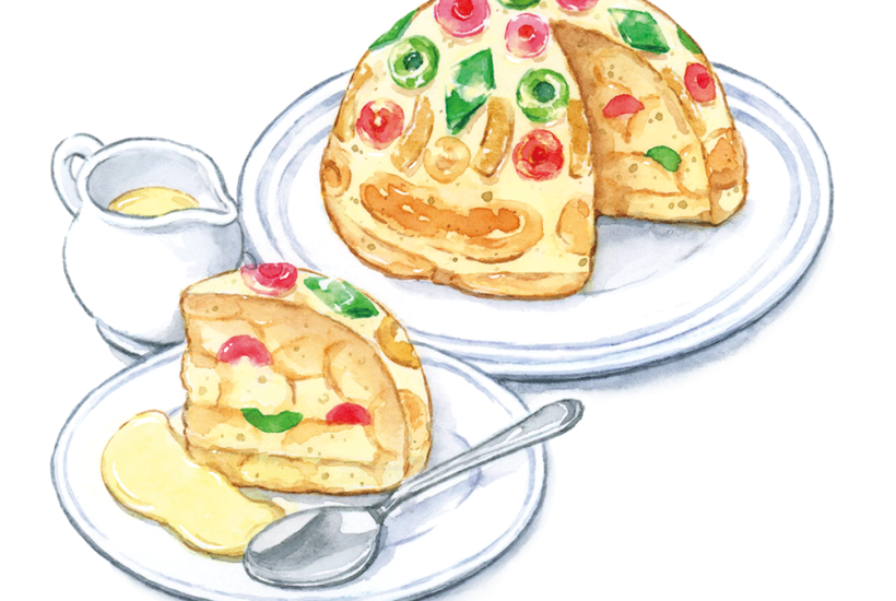 The first mention of ‘cabinet pudding’ is found in William Kitchiner’s The Cook’s Oracle and House Keeper’s Manual, which was published in 1822. This calls for the cook to take a pudding basin and ‘fill up with bread and butter, &c’. But by 1836 we’re getting closer to the savoiardi and custard duo: in John Mollard’s The Art of Cookery, the recipe says to pour hot milk over cake or sponge biscuits before mixing egg whites through the dish, and steaming.
