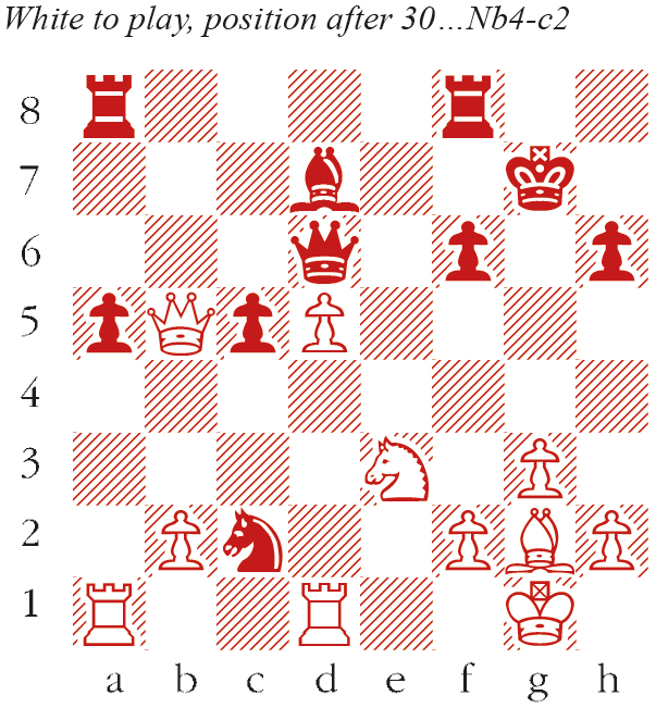 1 d4 Nf6 2 c4 e6 3 g3 d5 4 Bg2 Be7 5 Nf3 O-O 6 O-O Nbd7 7 Qc2 a5 8 Bg5 h6 9 Bxf6 Nxf6 10 Nc3 c6 11 Rfd1 b6 12 e4 dxc4 13 Ne5 Bb7 14 Nxc4 b5 15 Ne3 Rc8 16 Rac1 Qb6 17 e5 Nd5 18 Ne4 Restraining the c6-c5 break is the key strategic tussle in this middlegame. Therefore, 18…Nxe3 19 fxe3 c5! was called for, to liberate the Bb7 and Rc8. For example, 20 Nxc5 Bxg2 21 Kxg2 Rc7 followed by Rfc8 gives roughly equal chances. Nb4 Probably played in the expectation that the queen would move to b3 or b1, but Navara responds more ambitiously. 19 Qe2 Nxa2 20 Ra1 Nb4 21 Nf6+ A powerful shot, which Navara must have planned in advance. Now if 21…gxf6 22 Qg4+ Kh8 23 Qh4 Kg7 24 Ng4 yields a decisive attack. Bxf6 22 exf6 Qd8 There is no time to recapture: the queen is urgently needed in defence. 23 fxg7 Kxg7 24 Ng4 Ra8 A baffling move at first sight, but this prepares Bb7-c8 in what follows. 25 Qe5+ f6 26 Qxe6 Bc8 27 Qe2 Qd6 28 Ne3 Bd7 Material parity is restored, and Navara’s safer king confers a healthy edge. Now he initiates a new tactical storm. 29 d5 c5 30 Qxb5! Simple enough, since 30…Bxb5 31 Nf5+ recovers the queen, but there is a deeper point to come Nc2! (see diagram) 31 Qc6!! Magnificent. In case of 31…Bxc6 32 Nf5+ Kh8 33 Nxd6 Nxa1 34 dxc6 the c-pawn will decide the game. Qe7 32 Qc7 Nxe3 33 d6! Navara allows no respite. Incredibly, the Ne3 will never actually be captured. Qe6 34 Re1 Ra6 35 Rad1! Much stronger than 35 Rxe3 Qxd6, when Black may hope to survive. Qg4 Eyeing up the Rd1 forestalls Re1xe3 and Re3-e7+, but the queen is also tied to the defence of d7, hence what follows: 36 h3! Qa4 37 b3! Qxb3 37…Qb5 38 Rxe3 is hopeless. 38 Qxd7+ Rf7 39 Qxf7+ Kxf7 40 d7 Nxg2 41 Re7+! A stylish end to a beautiful game. Kxe7 42 d8=Q+ Kf7 43 Rd7+ Kg6 44 Qe8+ Kg5 45 Qe4! This quiet move is the easiest way. There are too many threats to handle. f5 46 Rg7+ Rg6 47 h4+ Kf6 48 Qe7 checkmate.