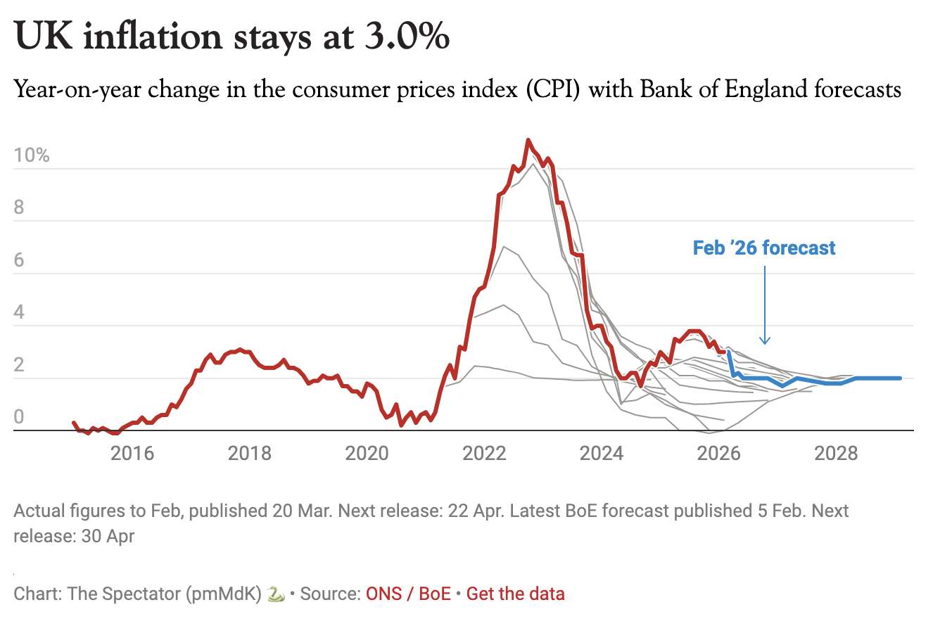 Prices rose by 3 per cent last month – the same rate as the month before. Figures just released by the Office for National Statistics (ONS) show that – ironically – falling petrol costs were one of the main things keeping the Consumer Prices Index (CPI) from climbing. This data was, of course, collected before the latest conflict in the Middle East – and we can soon expect the numbers to start heading in the wrong direction.