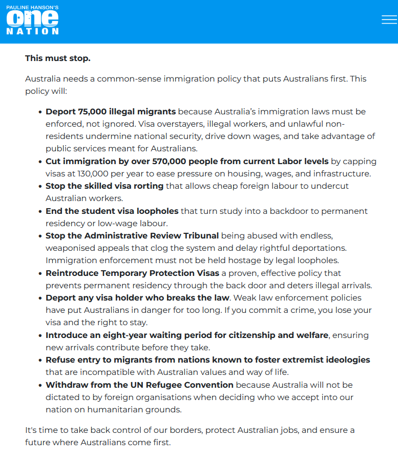 One Nation has been at the forefront of migration policy. Many months ago, One Nation posted their policy which states, among other things, the deportation of 75,000 illegal migrants.