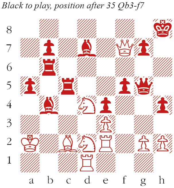 1 d4 d5 2 c4 e6 3 Nc3 Be7 4 Nf3 Nf6 5 Bf4 O-O 6 e3 c5 7 dxc5 Bxc5 8 a3 Nc6 9 Qc2 This line of the Queen’s Gambit Declined has been heavily tested at the top level, including during the Carlsen-Caruana World Championship match in 2018, when Caruana played 9…Qa5 on two occasions. Sindarov had prepared a different idea. Re8 10 Bg5 d4 11 Bxf6 Qxf6 12 Ne4 Qf5 13 b4 Nxb4!? To my eye, the compensation after 13…Bf8 14 exd4 looks rather thin, though the computer considers it sufficient. But Sindarov’s sacrifice is far more enterprising. 14 axb4 Bxb4+ 15 Kd1 dxe3 16 Bd3 Qg6 17 fxe3 f5 18 Ng3 Bc5 A strange position. Black has no direct attack, but the bishop pair and passed a-pawn are enduring assets, and in the long term White’s king lacks a safe harbour. 19 Qc3 19 Ke2 looks natural, but after 19…Qh6 20 Qc1 a5 Black’s game is much easier. e5! Exploiting the fact that 20 Nxe5 Qf6 wins material. 20 Bc2 e4 21 Nd2 21 Nd4 is desirable, but collapses after 21…f4! 22 exf4 Rd8 23 Ne2 Qxg2 Rd8 22 Kc1 Qg5 23 Re1 Qe7 24 Re2 Bb4 25 Qb2 a5 26 Nb3 Ra6 27 Nd4 Qg5 28 Kb1 h5 This move makes a profound impression. Despite his material deficit, Sindarov proceeds calmly to restrain the Ng3. 29 Ka2 h4 30 Nf1 Bd7 31 Rd1 Rc8 32 Nd2 Rb6 33 c5? A blunder under pressure. 33 Rb1 was still viable. Rxc5 34 Qb3+ Kh8 35 Qf7? (see diagram) Praggnanandhaa must have counted on this when venturing 33 c5, but there is a flaw: Rxc2+ Decisive, as 36 Nxc2 Be6+ wins the queen. 36 Kb1 Rxd2 37 Rdxd2 Bxd2+ 38 Ka2 Bxe3 39 Qxd7 Bxd4 40 Qxd4 Qf6 White resigns