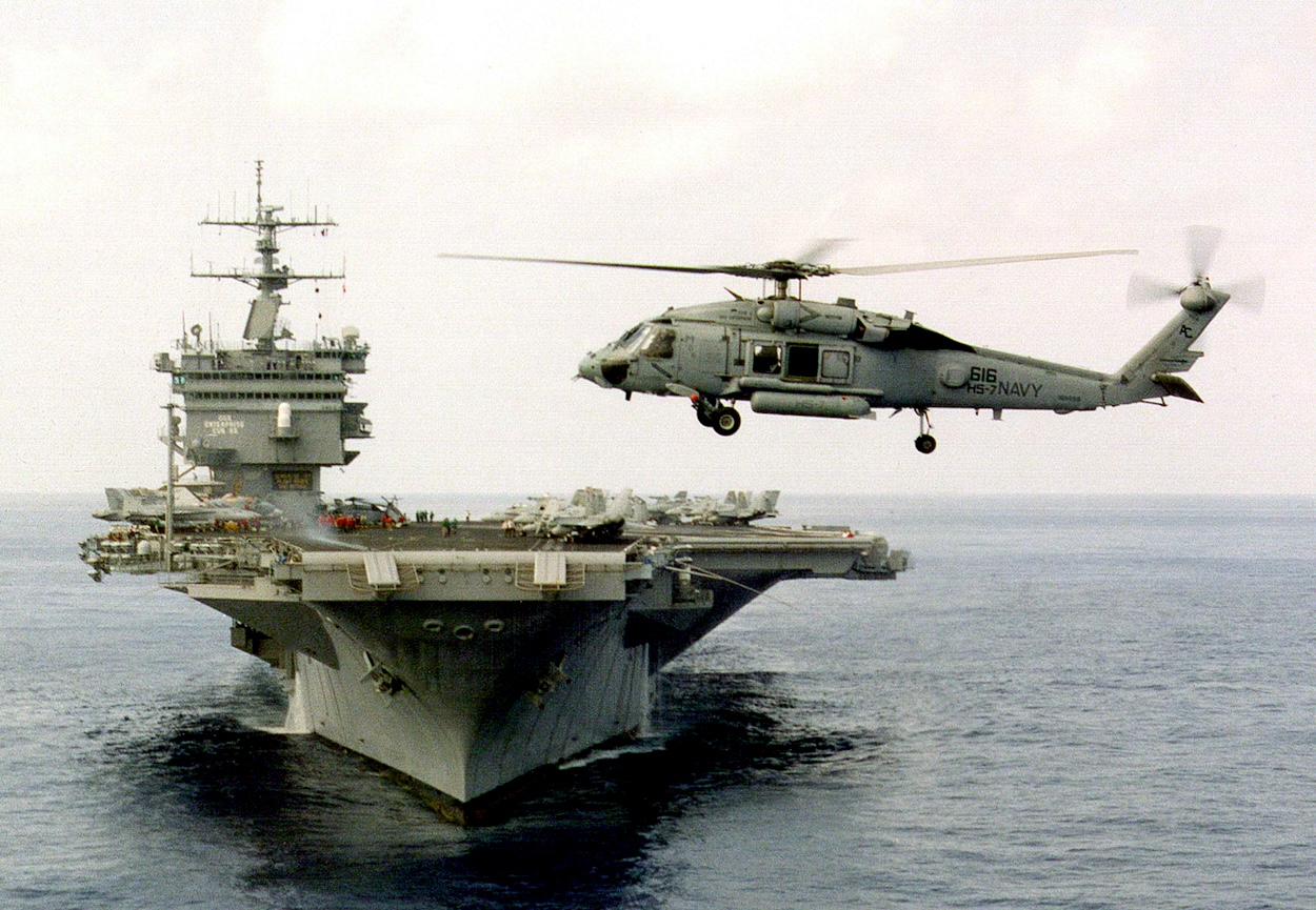A US Navy SH-60 helicopter hovers off the bow of the USS Enterprise Getty Images