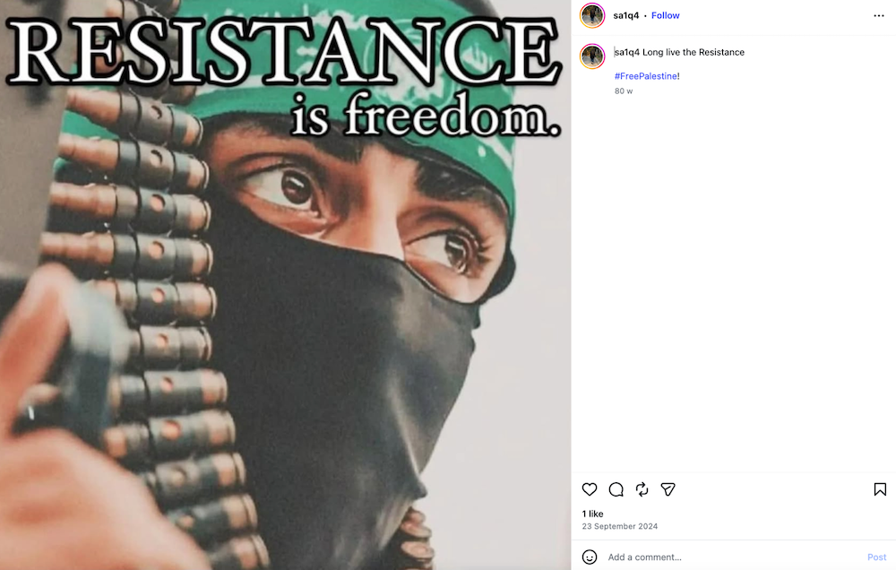 On 23 September 2024, Ali’s Instagram account posted a picture of a masked fighter, holding a rifle and a string of bullets and wearing what appears to be a Hamas headband. ‘Long live the Resistance,’ writes Ali. ‘Free Palestine!’